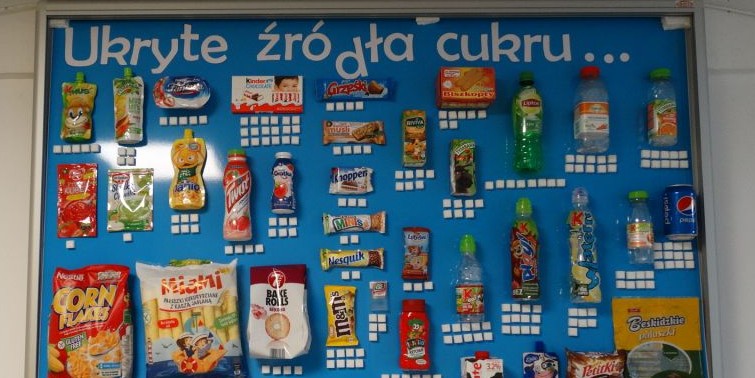 Samorząd Uczniowski przygotował na szkolnym korytarzu gablotkę „Ukryte źródła cukru” propagującą zdrowy styl życia. Jest to informacja dla wszystkich ile kalorii znajdziemy w znanych i często kupowanych produktach. Nie zdajemy sobie sprawy, że cukier w dużych ilościach znajduje się nie tylko w słodyczach, deserach i napojach, ale nawet w pozornie zdrowych produktach. Należy go unikać ze względu na ryzyko nadwagi i problemów zdrowotnych. Dlatego pojawił się pomysł, aby przedstawić jaką zawartość cukru można znaleźć w produktach spożywczych chętnie jedzonych przez dzieci. Pod każdym produktem znajduje się ilość cukru w nim zawartego przedstawiona za pomocą kostek cukru. 1 kostka oznacza 3 gramy cukru.